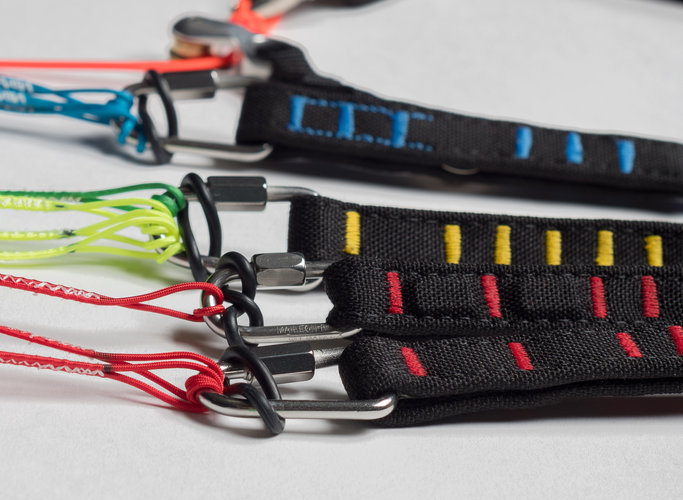Einfach die Übersicht behalten. Der ION 6 hat speziell auf seine Konstruktion abgestimmte Tragegurte mit Schränkungsverstellung. Dieses System kommt z. B. ebenfalls beim MENTOR 6 (EN/LTF B) und SECTOR (EN/LTF C) zum Einsatz. Was heißt das? Die A3-Leine wird beim Beschleunigen weniger stark verkürzt als A1 und A2. Das erhöht die Stabilität des Gleitschirms im beschleunigten Flug. Ansonsten sind die Riser wie gewohnt gestaltet und sehr übersichtlich bei Start und Groundhandling. Die farbigen Markierungen für rechts und links, die sich auch an den Bremsgriffen und den Karabinern unserer Gurtzeuge fortsetzen, machen es einfach zu überprüfen, ob man sich richtig eingehängt hat. Übrigens: Auch das Leinensortieren fällt leicht, denn der ION 6 hat ummantelte Stamm-, Brems- und Stabilo-Leinen und folgt dem von der PMA empfohlenen Farbschema: A – Rot, B – Gelb, C – Blau, Bremsen – Orange, Stabiloleinen – Grün.